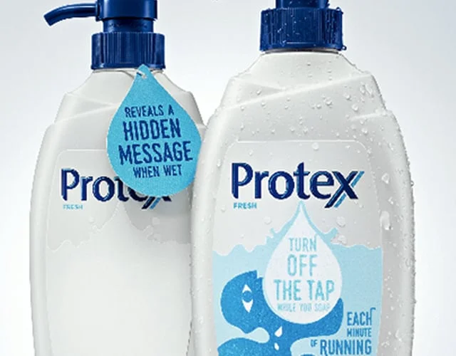To promote water-saving, Protex replaced their body wash bottle labels with special water reactive labels and turn their bottles to a timely water-saving reminders that triggered immediately where and when water is being wasted.